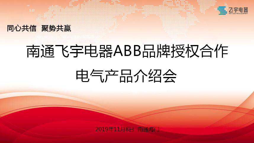 此次ABB品牌授權(quán)合作電氣產(chǎn)品介紹會不僅是我們飛宇電器經(jīng)過十年跨越發(fā)展的首次亮相,也是對我們公司產(chǎn)品的首次檢閱。飛宇電器將牢牢抓住此次與ABB合作生產(chǎn)的機遇,緊跟時代,闊步向前,全面提升品牌價值。