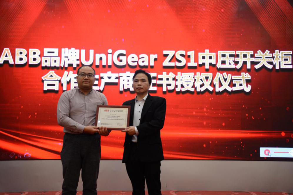 ABB作為全球領(lǐng)先的中、低壓開關(guān)柜和斷路器制造商,已連續(xù)多年躋身“中國電氣工業(yè)100強”和“世界500強企業(yè)”行列。公司市場部經(jīng)理蘇銀鐘作為南通飛宇電器設(shè)備有限公司的代表,接受了ABB品牌UniGear ZS1中壓開關(guān)柜合作生產(chǎn)商證書牌匾的授予。